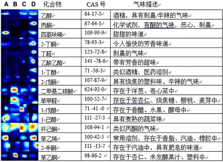 通過GC-IMS在6分鐘內(nèi)獲得的色譜圖顯示了在所有顆粒化聚合物(A-D)中存在大量的VOCs(與藍(lán)色背景不同的斑點)。濃度越大,峰強(qiáng)度越高(紅色表示)。這表明這些材料是汽車艙內(nèi)空氣中VOCs的主要來源。此外,通過所選擇的氣味化合物的信號,鑒定了與氣味相關(guān)的一些揮發(fā)性化合物,并比較了峰的強(qiáng)度。從中可以看出,樣品D具有更高濃度的氣味化合物。因此,我們可以通過GC-IMS快速分析、測定車輛內(nèi)飾使用的聚合材料所發(fā)出的氣味相關(guān)的VOCs,從而確定車內(nèi)氣味來源。