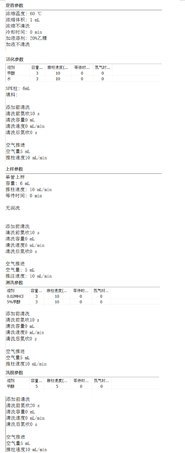 取HLB固相萃取柱,依次用3mL甲醇和3mL水活化。去備用液過柱,依次用0.02mol/L鹽酸3mL和5%甲醇淋洗。用5mL甲醇洗脫,收集洗脫液,氮氣吹干,加入20%乙腈溶液1mL充分溶解,過0.22μm濾膜,上機測定。