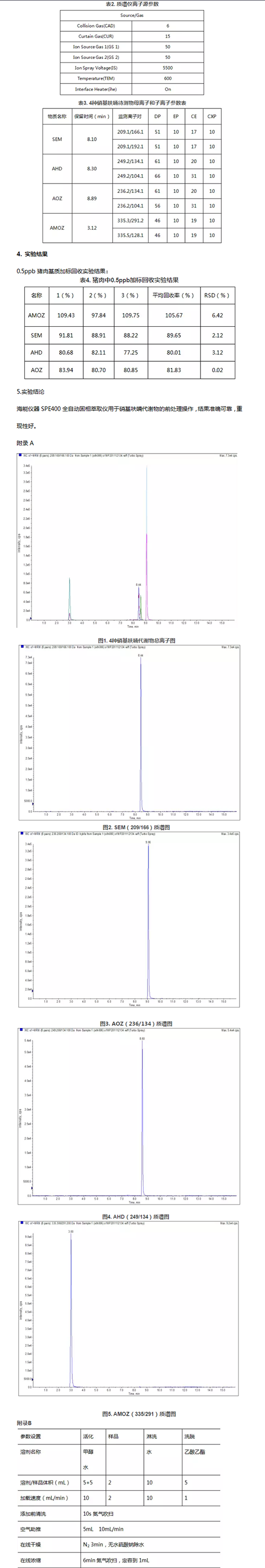 參照中華人民共和國國家標(biāo)準(zhǔn)《豬肉、牛肉、雞肉、豬肝和水產(chǎn)品中硝基呋喃類代謝物殘留量的測(cè)定(GB/T 20752-2006)》提供的方法,檢測(cè)豬肉中的4種硝基呋喃類代謝物殘留。