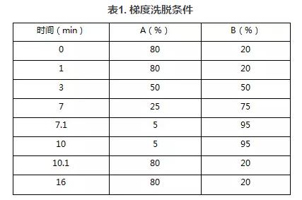 流動(dòng)相:A:0.1%甲酸的水溶液 B:0.1%甲酸的乙腈溶液