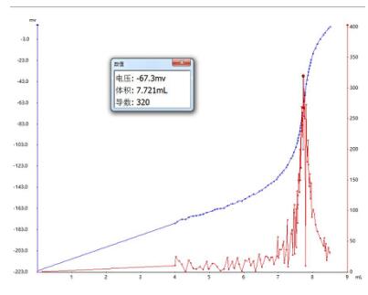 由于樣品成分復(fù)雜,峰形毛刺較多,建議偏高設(shè)置電位突躍量,最后用“參數(shù)設(shè)置”和“數(shù)據(jù)平滑”的方式尋找終點(diǎn)。