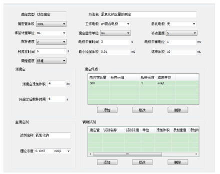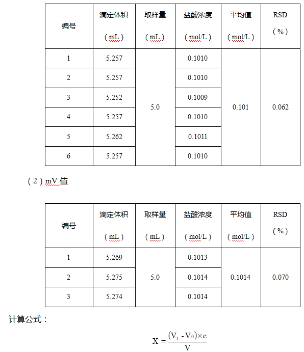 用大肚移液管取5.0mL鹽酸,加入50mL水,用氫氧化鈉標準溶液滴定至終點,分別用pH和mV值顯示。同時做空白實驗。
