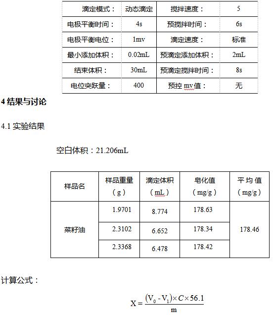 皂化是指油中的甘油酯與強堿溶液相化合,生成甘油和高分子脂肪酸的鈉鹽或鉀鹽的化學(xué)反應(yīng),因此油品的皂化值實際上是表示油中有機酸性物質(zhì)和酯類的總含量。皂化值的大小可以說明油的劣化程度,不純的油脂皂化值低,皂化值與酸值差距越大,油品劣化后形成油泥沉淀物的傾向越大。測定皂化值可以評定油脂的純度和對制皂工業(yè)提供計算加堿量的依據(jù)。本文用電位滴定的方法測得菜籽油的皂化值為178.46mg/g,符合國標(biāo)要求。