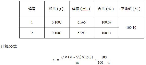 氟康唑原料藥含量大于99.0%即為合格,本次實(shí)驗(yàn)樣品氟康唑原料藥中含量為100.10%,符合要求。另外,實(shí)驗(yàn)結(jié)果表明,本次實(shí)驗(yàn)重復(fù)性良好,可以滿足檢測需求。