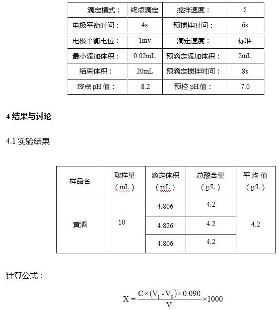 吸取黃酒樣品10mL于滴定杯中 , 插入電極,攪拌均勻后,初始階段以0.5mL的快滴速度滴加氫氧化鈉標準滴定溶液,當樣液pH值為7后,再以0.02mL的慢滴速度滴加氫氧化鈉滴定液,直至pH為8.2為其終點,記錄消耗氫氧化鈉標準滴定溶液的體積。