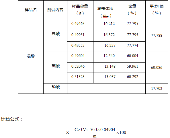 取平行測(cè)試結(jié)果的算術(shù)平均值為測(cè)定結(jié)果,可以看出先測(cè)量總酸硫酸含量再利用差值計(jì)算硝酸含量的方法可行,且實(shí)驗(yàn)重復(fù)性良好。