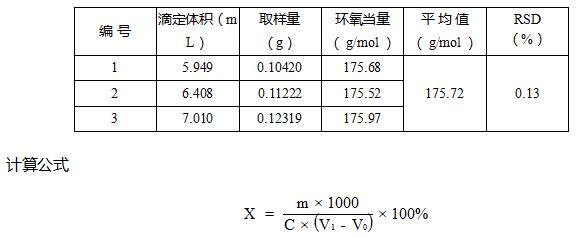 測(cè)試結(jié)果RSD值為0.13%,測(cè)定的環(huán)氧當(dāng)量重復(fù)性良好。