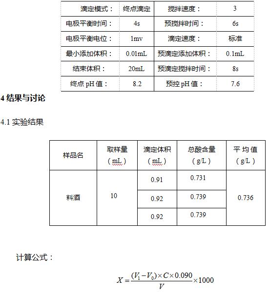 料酒是烹飪用酒的稱呼,添加黃酒,花雕釀制,其酒精濃度低,含量在15%以下。料酒的主要成分有黃酒,糖分,糊精,有機(jī)酸類,氨基酸等,可以增加食物的香味,去腥解膩。酸是料酒的呈味物質(zhì)之一,適量,組成合理的酸含量,賦予料酒在日常使用中更協(xié)調(diào)的口感,在國(guó)家標(biāo)準(zhǔn)《SB/T 10416-2007 調(diào)味料酒》中對(duì)于其氨基酸態(tài)氮含量測(cè)定范圍為≤5g/L。本方采用電位滴定的方法,測(cè)得料酒中總酸含量為1.03g/L。