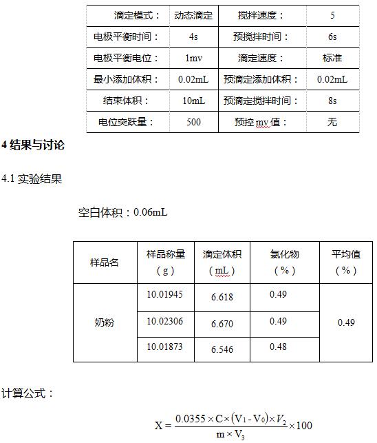 從測(cè)定結(jié)果可以看出,用電位滴定法測(cè)定奶粉中氯離子含量,兩次平行測(cè)定的絕對(duì)差值均不大于3%,實(shí)驗(yàn)結(jié)果重復(fù)性較好。