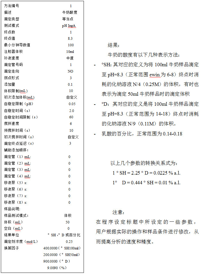 牛奶的酸度取決于牛奶中乳酸含量和蛋白質的酸反應。目前使用電位滴定法,NaOH滴定至pH達到8.3時為滴定的終點值。此外,可滴定酸度,旋光(°D)或乳酸的百分比(%)表示。本實驗中電位滴定法適用于任何類型的牛奶(全脂或脫脂等)。