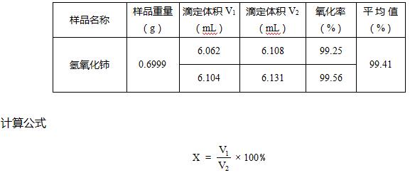 鈰產(chǎn)品是產(chǎn)量最大的稀土產(chǎn)品,三價鈰產(chǎn)品以碳酸鈰為主,四價鈰產(chǎn)品則以氫氧化鈰為主。氫氧化鈰主要用于熒光屏添加劑、制備汽車尾氣凈化催化劑的原料、合成硝酸鈰銨的原料等,其合成方法有傳統(tǒng)法、堿轉(zhuǎn)換法和集成法等,均以碳酸鈰為主要原料。但在合成氫氧化鈰時總是存在部分三價鈰,因此測定四價鈰的含量(即氧化率)可以作為判定其純度的依據(jù)。