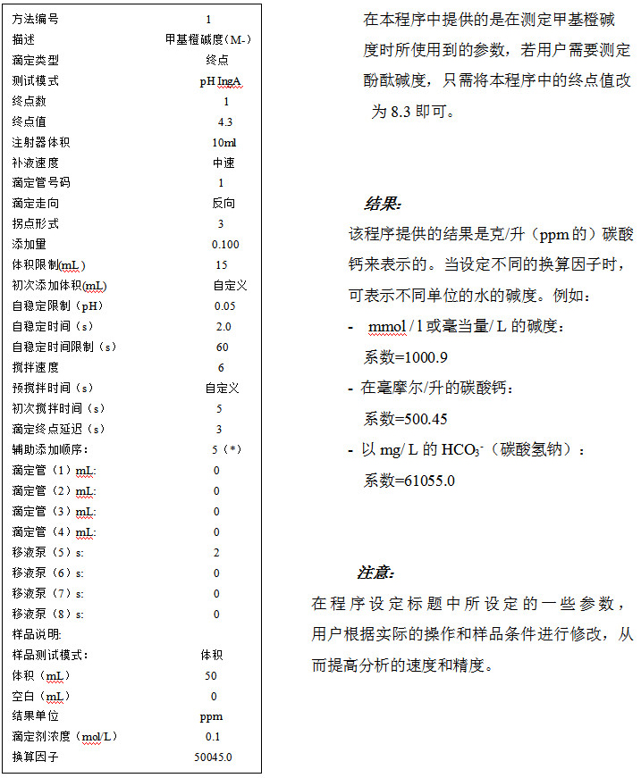 1、使用“新方法”,選擇“終點(diǎn)”類型,將終點(diǎn)設(shè)定為pH=4.3來測(cè)定水的堿度。