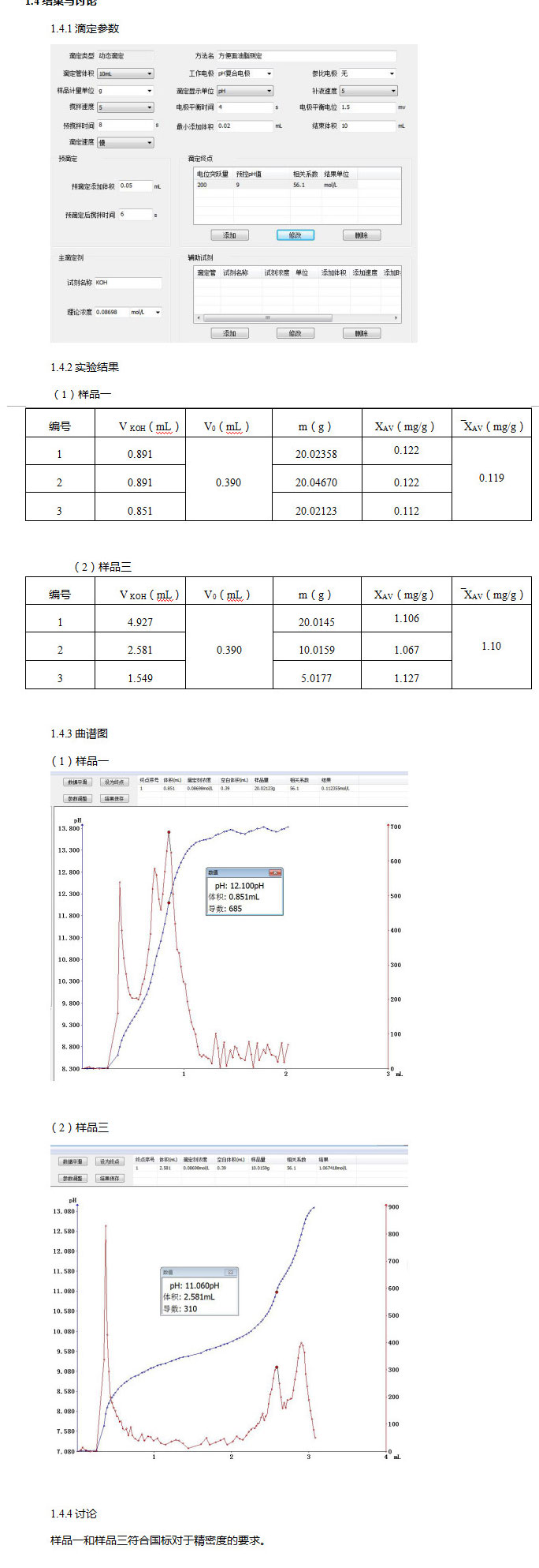 1.3.1實(shí)驗(yàn)步驟:準(zhǔn)確稱(chēng)取20g左右的油脂(若為固體先將其融化),置于滴定杯中。加入異丙醇-乙醚混合溶液60mL溶解,攪拌均勻,用氫氧化鉀標(biāo)準(zhǔn)滴定液(0.1mol/L)進(jìn)行滴定至終點(diǎn)。