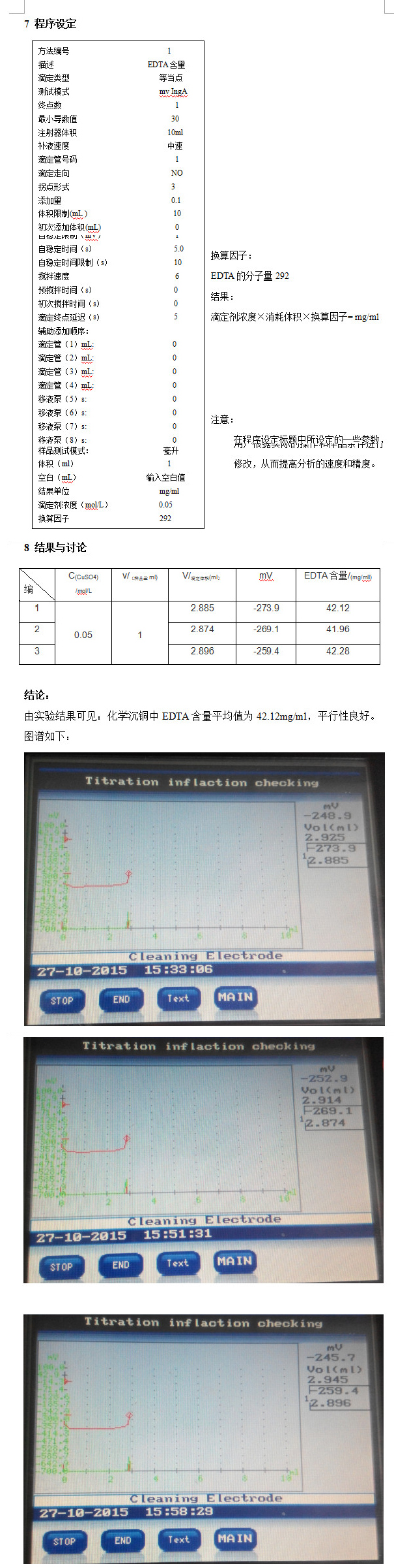 本實(shí)驗(yàn)以銅離子復(fù)合選擇電極為指示電極,用NH3-NH4Cl為緩沖溶液調(diào)節(jié)溶液pH值,用標(biāo)定好的硫酸銅溶液進(jìn)行滴定,設(shè)置參數(shù)進(jìn)行實(shí)驗(yàn)。