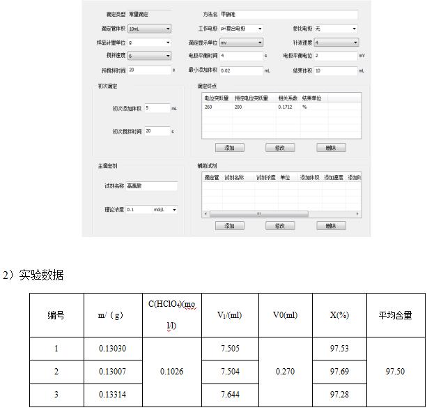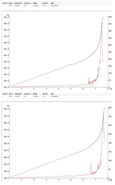 樣品中甲硝唑含量為97.50%(此結(jié)果按濕品計(jì)算)。樣品中的水分會(huì)對(duì)重復(fù)性有影響,建議用干品進(jìn)行試驗(yàn)。從圖譜中可看出,突躍大滴定終點(diǎn)一目了然。配合滴定儀自動(dòng)進(jìn)樣器進(jìn)行滴定,操作方便節(jié)省了時(shí)間和人力,能快速的檢測(cè)出結(jié)果。