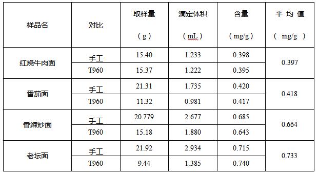由酸價(jià)圖譜可知,不同的方便面油脂圖形走勢不同,所以需要根據(jù)國標(biāo)中提供的參考圖仔細(xì)分辨,實(shí)驗(yàn)結(jié)果平行良好,可以使用自動進(jìn)樣器進(jìn)行滴定。另外,酸價(jià)圖譜前端均出現(xiàn)高突躍量的雜峰,所以應(yīng)設(shè)置相應(yīng)的預(yù)控pH值,以免影響最終結(jié)果的判定。