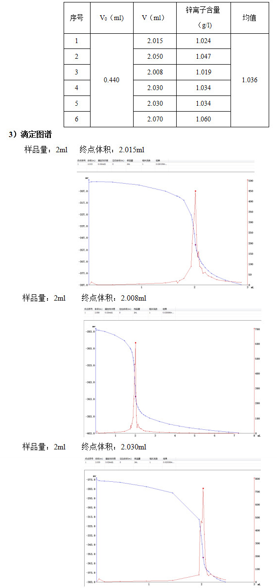 取2ml氯化鋅溶液作為被測溶液,加入PH=10的緩沖溶液1.5ml、0.05mol/l的Cu-EDTA溶液3ml、水60ml,在T960電位滴定儀上滴定至終點(diǎn),同時(shí)作空白試驗(yàn)。