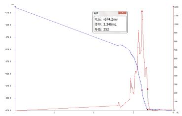 吸取堿性酒石酸銅甲液5.0mL和堿性酒石酸銅乙液5.0mL于滴定杯中,加水10mL,再加入2mL試樣稀釋液,將電陶爐設(shè)為內(nèi)環(huán)火500℃,控制在2min內(nèi)加熱至沸,選擇“動態(tài)滴定”模式,保持微沸滴定至終點,記錄樣液消耗滴定液的體積。