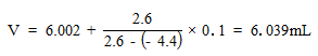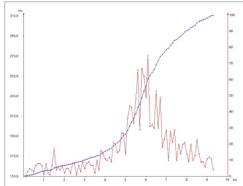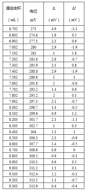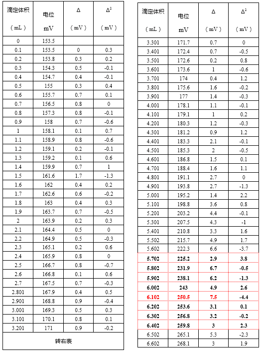 計(jì)量點(diǎn)在最大的Δ/mV(第三列),即在6.002mL和6.102mL之間。由Δ2/mV(第四列)按下式計(jì)算在0.10間隔的準(zhǔn)確計(jì)量點(diǎn):