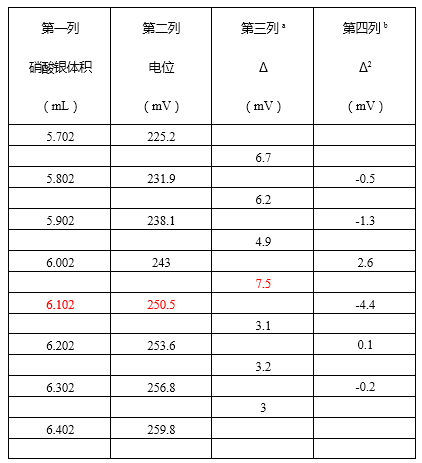 稱取約5g試樣,精確至0.0001g,置于滴定杯中,加入20mL水和攪拌子,磁力攪拌使試樣完全分散,然后在攪拌下加入25mL硝酸(1+1),加入55mL水。加入2.00mL氯離子標(biāo)準(zhǔn)溶液(0.02mol/L)和2mL過氧化氫(30%),加熱煮沸,微沸1min~2min。冷卻至室溫,在溶液中插入氯離子電極和雙鹽橋甘汞電極,開始攪拌。用硝酸銀標(biāo)準(zhǔn)滴定溶液逐漸滴定,滴定至mV值讀數(shù)變化不大時(shí)為止。用二次微商法計(jì)算出消耗的硝酸銀標(biāo)準(zhǔn)滴定溶液的體積。二次微商法的計(jì)算參見附錄。