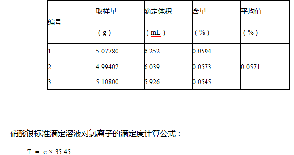 T --硝酸銀標(biāo)準(zhǔn)滴定溶液對(duì)氯離子的滴定度,單位為毫克每毫升(mg/mL);