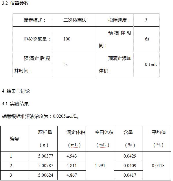 國標(biāo)要求重復(fù)性限為0.005%,本次實(shí)驗(yàn)結(jié)果最大差值是0.002%,符合文獻(xiàn)對(duì)于重復(fù)性限的要求。用電位滴定儀測(cè)定水泥的氯離子含量,操作步驟簡單,儀器可直接用二次微商法計(jì)算檢測(cè)結(jié)果,提高了工作效率。