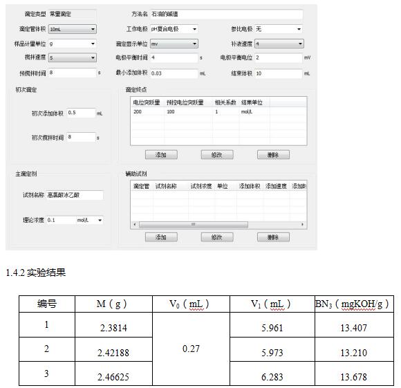1.3.2實(shí)驗(yàn)步驟:稱取約2.5g的石油,置于滴定杯中。先加入40mL氯苯,用電位滴定儀上的攪拌器攪拌溶液直到試樣完全溶解。再加入20mL冰乙酸。混勻后用高氯酸冰乙酸溶液(0.1mol/L)進(jìn)行滴定至終點(diǎn)。