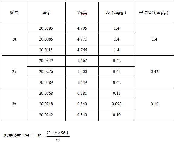 式中:x---試樣的酸價(jià)(以氫氧化鉀計(jì)),單位為毫克每克(mg/g)