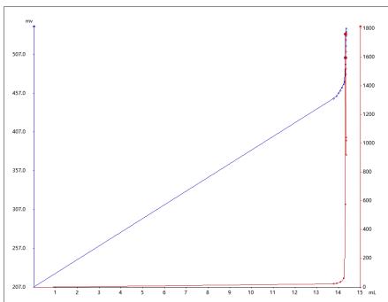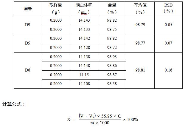 稱取約0.2g(精確至0.001g)標(biāo)準(zhǔn)鐵或樣品置于滴定杯中,加入鹽酸溶液50mL,于電熱板上加熱至盡沸(300℃)溶解。待試樣溶盡且溶液剩約15-20mL時,滴入二氯化錫溶液至淡黃色,冷卻。加入20滴鎢酸鈉溶液,繼續(xù)滴加三氯化鈦至溶液呈穩(wěn)定的鎢藍(lán)色。加入20mL硫磷混酸,搖勻,用0.05mol/L的重鉻酸鉀溶液滴至無色,用重鉻酸鉀溶液(0.25mol/L)進(jìn)行滴定至終點(diǎn)。