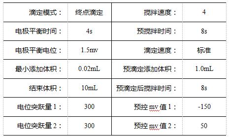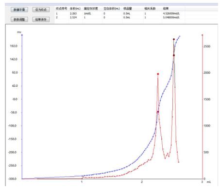 從電解液樣品中準(zhǔn)確移取0.5mL電解液原液,置于滴定杯中,加60mL蒸餾水,用鹽酸標(biāo)準(zhǔn)滴定液進行滴定,記錄第一個突躍點消耗的滴定液的體積V1,繼續(xù)滴定,記錄第二個突躍點消耗的滴定液的體積V2。