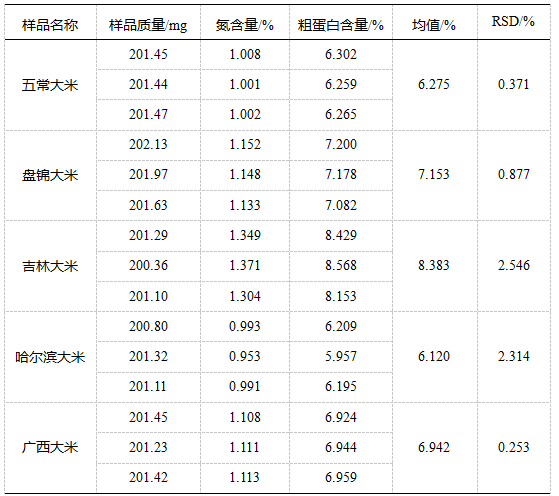 中國(guó)是世界第一大水稻生產(chǎn)國(guó),水稻是我國(guó)第一大糧食作物,大米中蛋白質(zhì)的生物價(jià)和氨基酸的構(gòu)成比例比小麥、大麥、小米、玉米等禾谷類作物高,消化率達(dá)66.8%~83.1%,有較高的營(yíng)養(yǎng)價(jià)值。大米種植范圍廣,品種多,本實(shí)驗(yàn)選取了五常、盤錦、吉林和廣西等區(qū)域的大米,使用杜馬斯分析儀進(jìn)行定量測(cè)定。