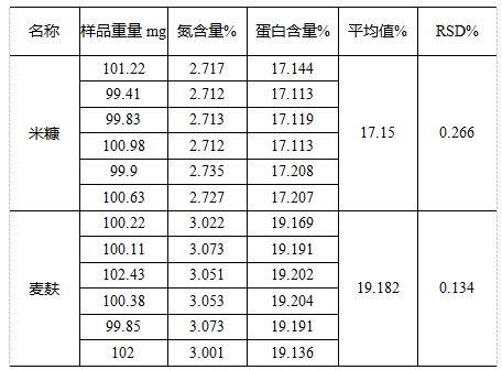 兩種測(cè)試結(jié)果平行性符合《GB/T 24318-2009 杜馬斯燃燒法測(cè)定飼料原料中總氮含量及粗蛋白質(zhì)的計(jì)算》標(biāo)準(zhǔn)要求的粉狀飼料的RSD小于0.444。
