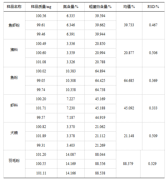 通過實(shí)驗(yàn)結(jié)果可以看到,使用D100杜馬斯定氮儀測試飼料中的粗蛋白含量測試快速,結(jié)果準(zhǔn)確,重復(fù)性符合標(biāo)準(zhǔn)。并且操作簡單便捷,可以作為常規(guī)測試方法。