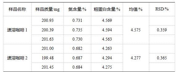 另外使用D100杜馬斯定氮儀測試速溶咖啡中的粗蛋白含量精密度符合《GB 5009.5-2016 食品安全國家標(biāo)準(zhǔn) 食品中蛋白質(zhì)的測定》中規(guī)定的兩次獨(dú)立測定結(jié)果的絕對差值不超過算術(shù)平均值的10%的要求,且RSD值為0.359%和0.365%,重復(fù)性良好。