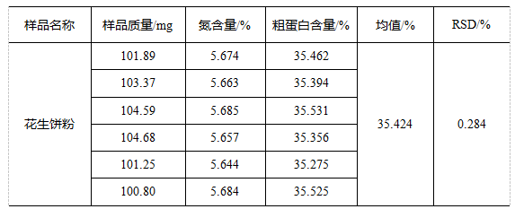 通過實驗結(jié)果可以看到,本次測試的花生餅粉粗蛋白含量為35.424%,低于市場上花生餅粉44%的蛋白質(zhì)含量。 另外使用D100杜馬斯定氮儀測試油枯餅中的粗蛋白含量,RSD值為0.284%,重復(fù)性良好。
