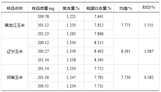 中國是世界第二大玉米生產(chǎn)國和第一大玉米消費(fèi)大國,播種面積僅次于稻、麥,在糧食作物中居第三位,玉米作為一種長壽食品,富含豐富的營養(yǎng)成分,其中蛋白質(zhì)含量是僅次于糖類的營養(yǎng)成分。本實(shí)驗(yàn)選取了黑龍江、遼寧和河南的大米,對玉米中的蛋白質(zhì)使用杜馬斯分析儀進(jìn)行定量測定。
