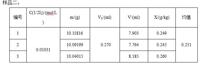 B--滴定試劑空白所用碘標(biāo)準(zhǔn)滴定溶液(0.01mol/L)的體積,單位為毫升(ml)