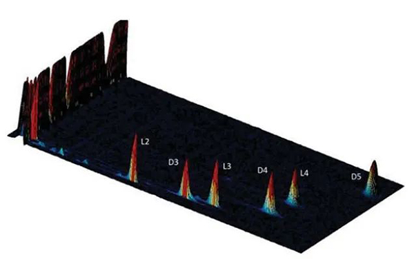 3.硅氧烷和其他氣體成分從氣相色譜柱中洗脫,并被引入IMS漂移管。低輻射氚源產(chǎn)生反應物離子H+(H2O)n。這些反應物離子與反應物離子發(fā)生質(zhì)子轉(zhuǎn)移產(chǎn)生特定的分析物離子。它們以規(guī)定的頻率(通常每30毫秒)釋放到漂移管中,在外加電場下通過遷移管。同時,氮氣以相反的方向逆向通過漂移管。當待測離子與氮氣流動逆向作用時,它們會因質(zhì)量和幾何形狀不同到達檢測器的時間不同,產(chǎn)生與撞擊檢測器的離子數(shù)量成正比的電勢變化(分析儀響應)。氣相色譜與離子遷移譜二次分離得到一個三維色譜圖,如下面的例子所示(參見圖1)。