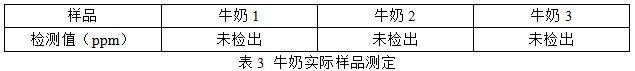 3.3 樣品檢測結(jié)果對從市場購買的四個不同品牌的牛奶用建立好的高效液相色譜法進行檢測,測得的結(jié)果如表3所示。結(jié)果表明,3個不同品牌牛奶中所含的三聚氰胺含量均符合國家限量標準。