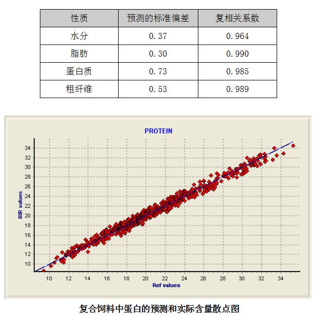建立復合飼料水分、蛋白質(zhì)、脂肪和粗纖維的偏最小二乘(PLS)模型。相關(guān)系數(shù)表示的是濕化學測試和近紅外測試結(jié)果的一致性。系數(shù)接近1幾乎完全相關(guān),這與實驗室的精密程度和成分范圍有關(guān)。預測的標準偏差反映了此定標模型對不參與制作建模的樣品集的預測性能。下表顯示的是模型外部預測的相關(guān)系數(shù)和標準偏差。
