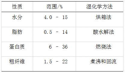 用約300份復合飼料建立了水分、蛋白質(zhì)、脂肪和粗纖維標準。下表顯示的是校正集樣品的水分、蛋白質(zhì)、脂肪和粗纖維范圍,以及分析用的濕化學方法。