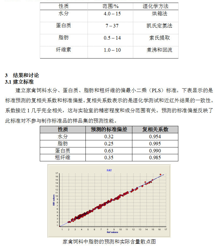 使用約300份家禽飼料建立了水分、蛋白質(zhì)、脂肪和粗纖維標(biāo)準(zhǔn)。下表顯示的是標(biāo)準(zhǔn)品的水分、蛋白質(zhì)、脂肪和粗纖維范圍,以及分析用的濕化學(xué)方法。