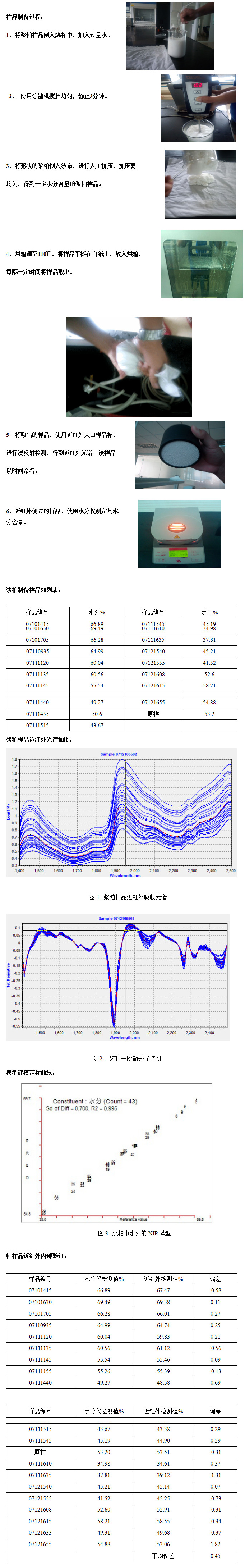 建立定標(biāo)模型數(shù)據(jù):制備不同水分含量的漿粕樣品21個(gè),每個(gè)樣品掃描2次(其中一個(gè)樣品掃描3次),共得43張光譜。