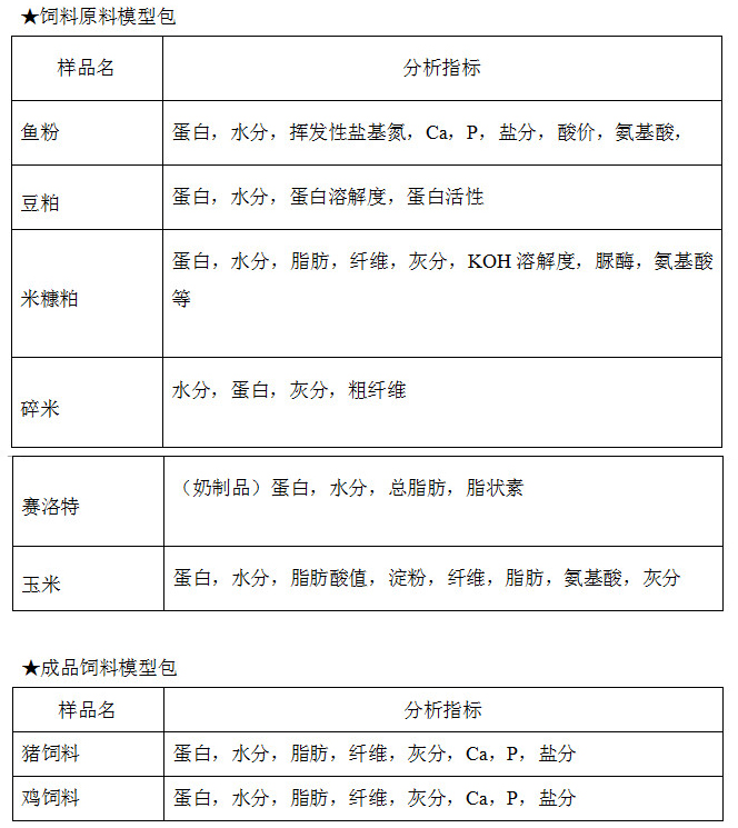 1. 根據(jù)檢測需求,為您制定兩個檢測模型包,包含飼料原料模型包和成品飼料模型包,初步建立統(tǒng)計模型如下列表。