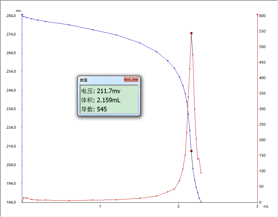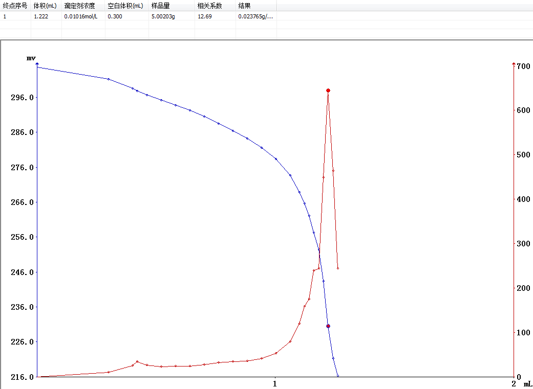 電位滴定法是一種經(jīng)典的分析方法,具有設(shè)備簡(jiǎn)單、操作簡(jiǎn)便、精確度高等優(yōu)點(diǎn)。電位滴定法測(cè)定對(duì)有色溶液、混濁溶液或沒有合適指示劑判斷終點(diǎn)的滴定分析較為適宜。儀器可自動(dòng)控制滴定過程、判斷終點(diǎn)、處理數(shù)據(jù),減少肉眼判斷終點(diǎn)引起的誤差,具有快速、簡(jiǎn)單等特點(diǎn);還可以減少人員與有機(jī)試劑的接觸,提高了人員的安全性。
