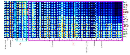 3. RIP峰右側(cè)的每一個點代表一種揮發(fā)性有機物如區(qū)域A,白色表示該揮發(fā)性有機物濃度較少,紅色表示該揮發(fā)性有機物濃度較大,顏色越深表示濃度越大(如區(qū)域B中標出的幾種揮發(fā)性有機物)。