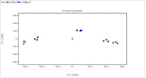 軟件根據(jù)所選擇揮發(fā)性有機物信號峰對其進行主成分分析,據(jù)此對樣品進行統(tǒng)計學上的分類,比較區(qū)別與差異,如下圖所示。
