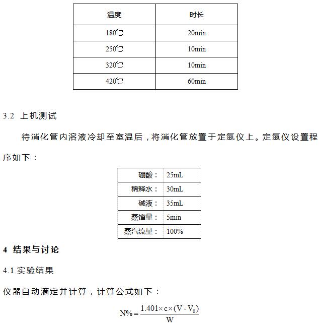 硫酸(分析純),硼酸(分析純),氧化鈉(分析純),溴甲酚綠-甲基紅混合指示劑,催化劑片(3g硫酸鉀和0.2g硫酸銅混合均勻壓片),0.1mol/L鹽酸標(biāo)準(zhǔn)滴定液。