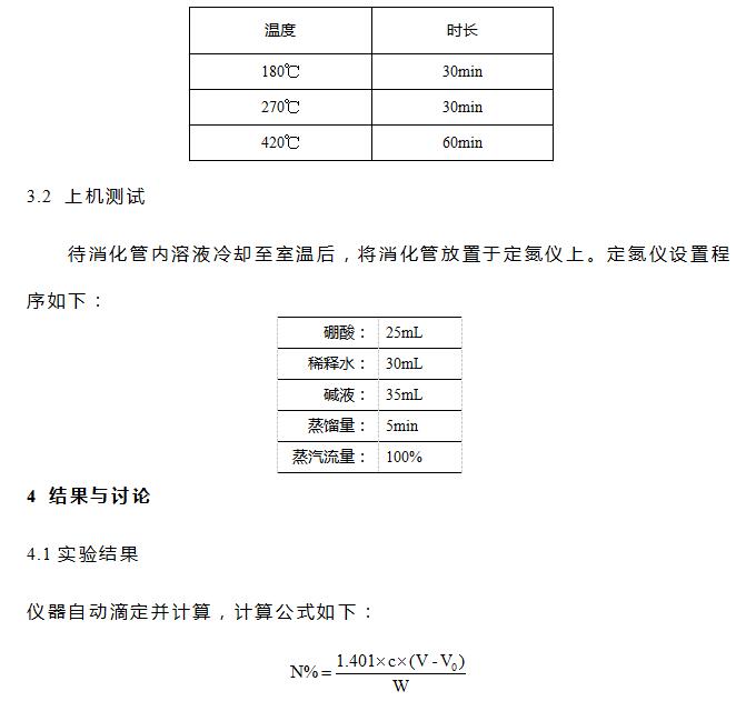 硫酸(分析純),硼酸(分析純),氧化鈉(分析純),溴甲酚綠-甲基紅混合指示劑,催化劑片(3g硫酸鉀和0.2g硫酸銅混合均勻壓片),0.1mol/L鹽酸標(biāo)準(zhǔn)滴定液。