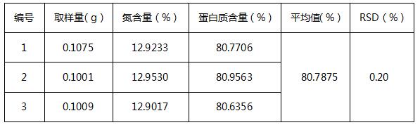 通過(guò)數(shù)據(jù)可知,此次樣品為三級(jí)蛋白粉,利用全自動(dòng)凱氏定氮法測(cè)定大豆肽粉中的蛋白質(zhì)含量平行性良好。